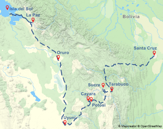 Privater Transport von Uyuni nach Oruro. Die Strasse führt über Colchani und biegt dann nach Nordosten ab, durchquert kleine Ausläufer der Anden und folgt der Eisenbahn durch das Hochland. Dabei passiert sie die kleinen Dörfer Rio Mulatos und Huari, bis sie Oruro erreicht (4 Stunden Fahrt).