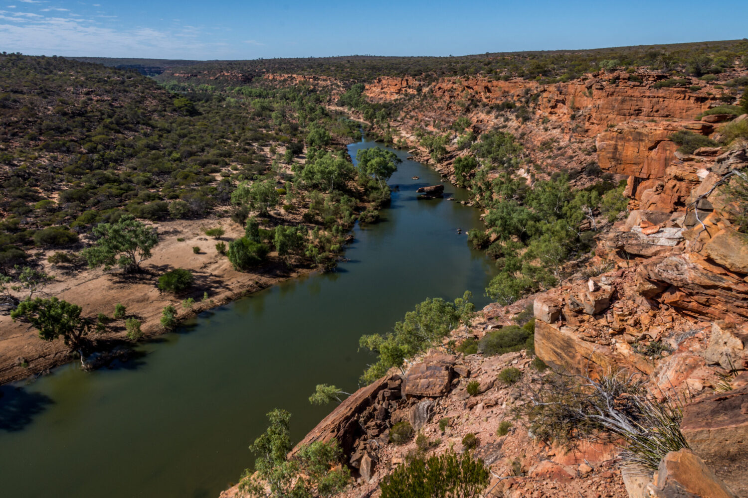 Weiter nördlich liegt der Kalbarri Nationalpark, einer der landschaftlichen Höhepunkte Westaustraliens. Tief eingeschnittene Schluchten, rot leuchtende Felswände und das smaragdgrüne Band des Murchison Rivers prägen das eindrucksvolle Bild dieser Region. Wanderungen durch die imposanten Schluchten, entlang steiler Felsformationen oder zu Aussichtspunkten wie Nature’s Window eröffnen atemberaubende Panoramen. Die Natur hier ist abwechslungsreich: zwischen den roten Felsen und grünen Tälern entfaltet sich eine üppige Pflanzenwelt, die besonders in den Frühlingsmonaten mit bunten Wildblumen beeindruckt. Die Ruhe und Weite des Parks laden zu ausgedehnten Spaziergängen, Fototouren und einfach zum Genießen der Natur ein.